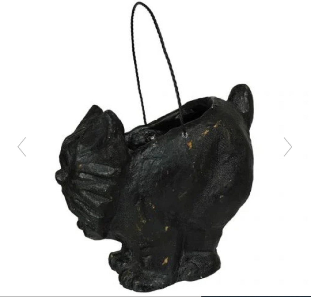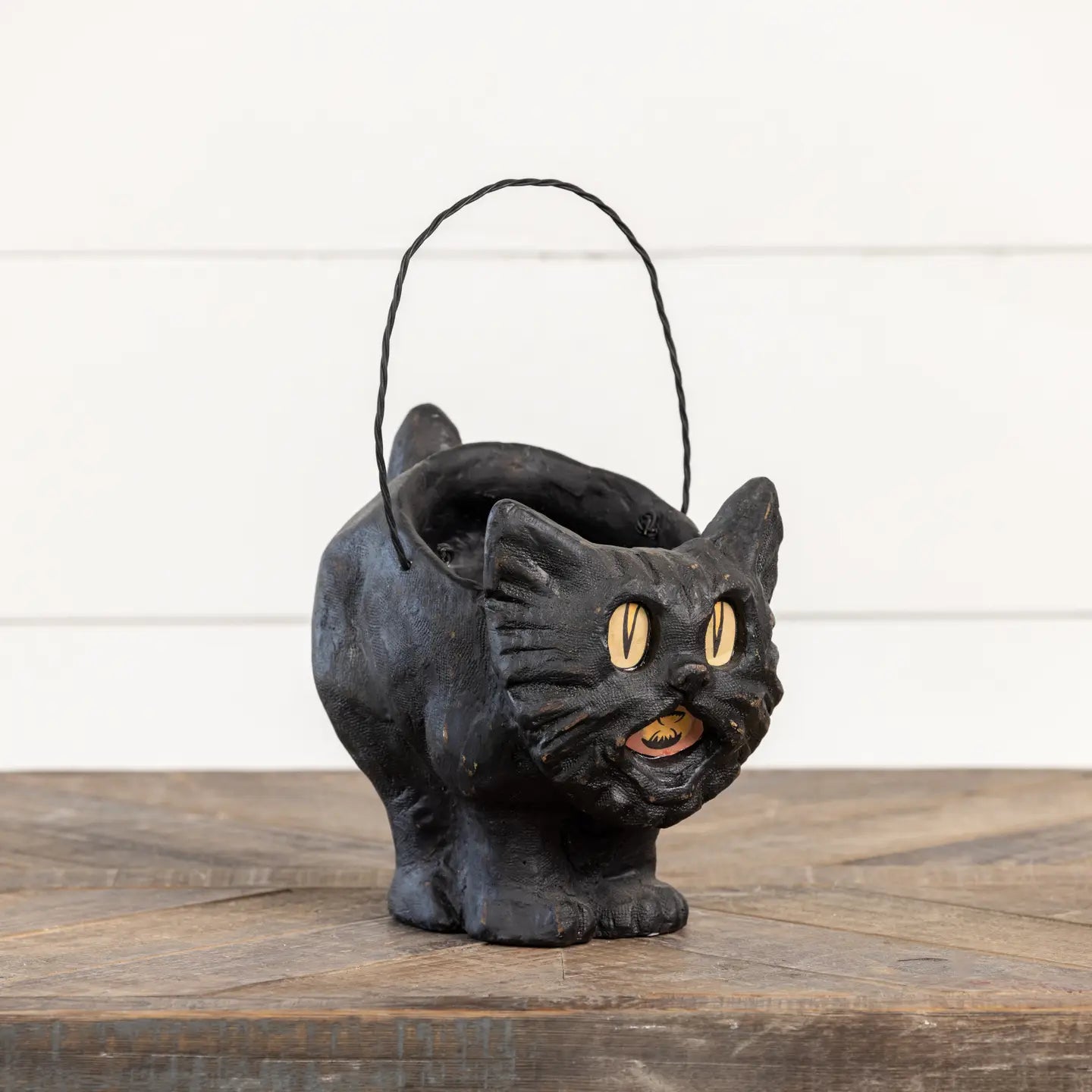 Ragon House Black Cat Paper Mache Bucket features a charming vintage design crafted from paper mache and wire. Measuring 8.25" x 8" x 6", this unique bucket is perfect for adding spooky style to your Halloween decorations.