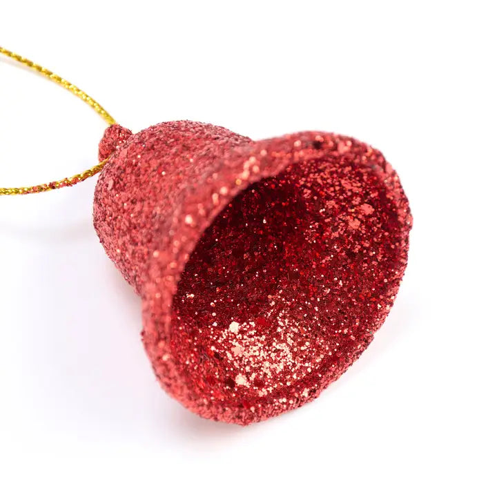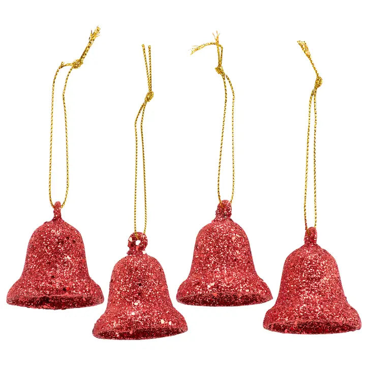 A set of 4 decorative ornaments from our Christmas Collection displaying sculpted small holiday bell designs with red glitter finish for added interest. Our mini Red Bells ornament set is easy to hang for display via attached string hangers. Seasonal ornament set comes packaged in a polybag with header card and hole for easy store rack display. A set of retro Christmas home accents perfect for a Christmas tree or for seasonal decorating.