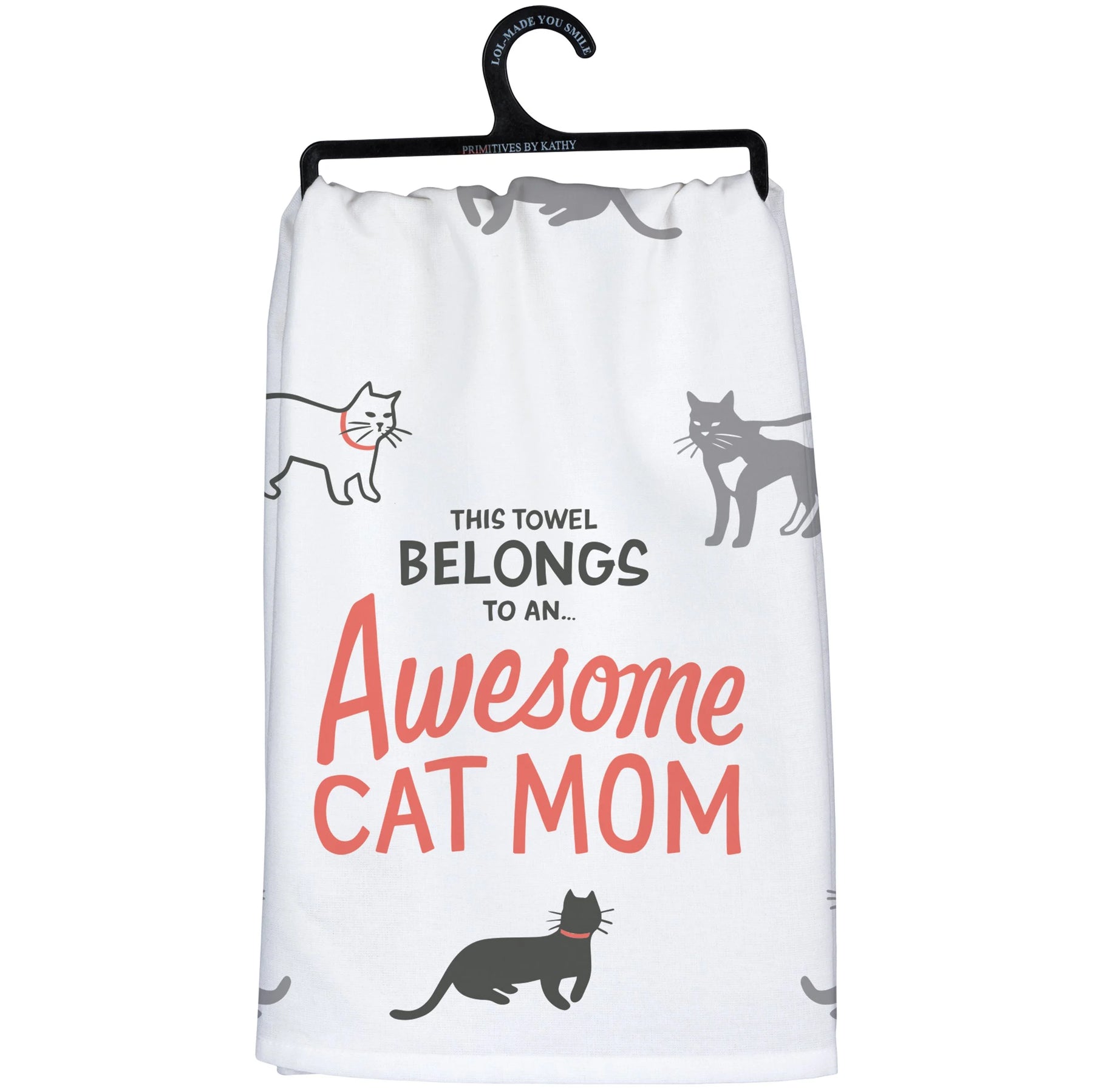 A cotton kitchen towel featuring a "This Towel Belongs To An… Awesome Cat Mom" sentiment with all-over cat designs. Our Awesome Cat Mom kitchen towel is machine-washable.