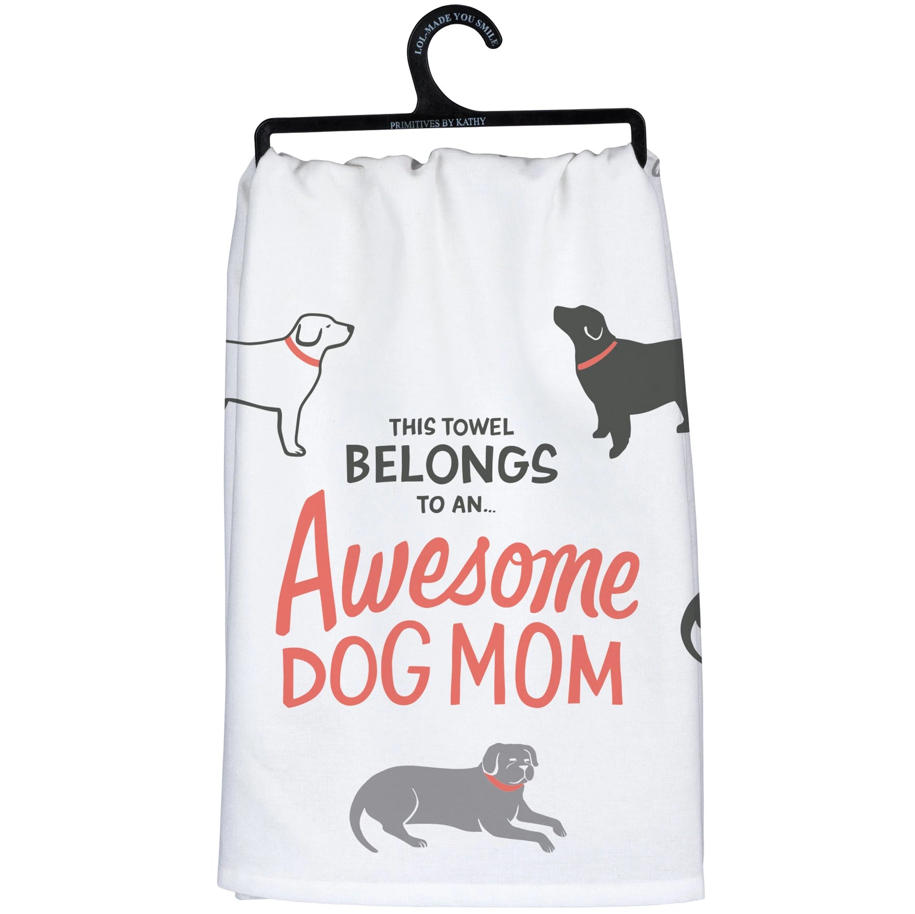 A cotton kitchen towel featuring a "This Towel Belongs To An… Awesome Dog Mom" sentiment with all-over cat designs. Our Awesome Dog Mom kitchen towel is machine-washable.