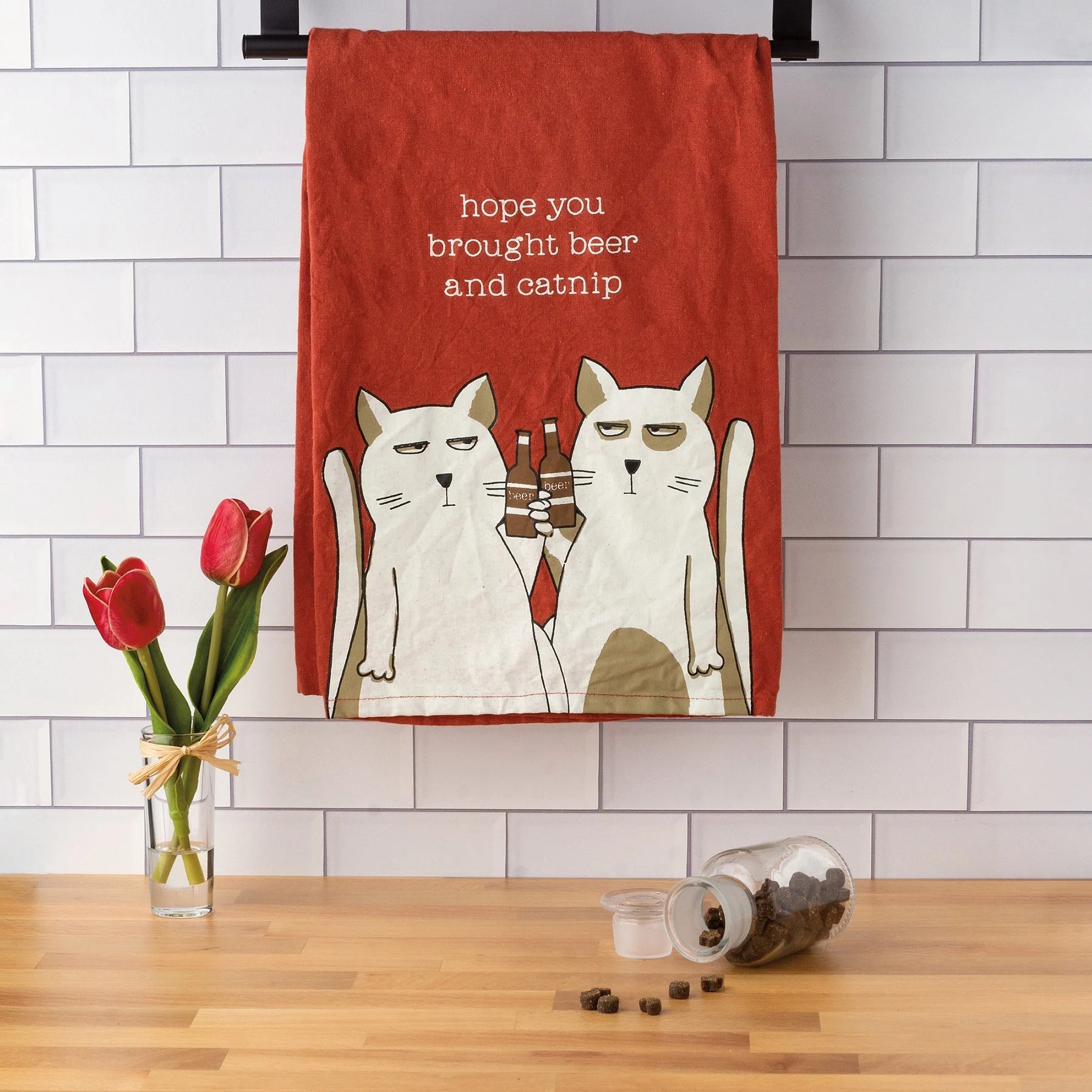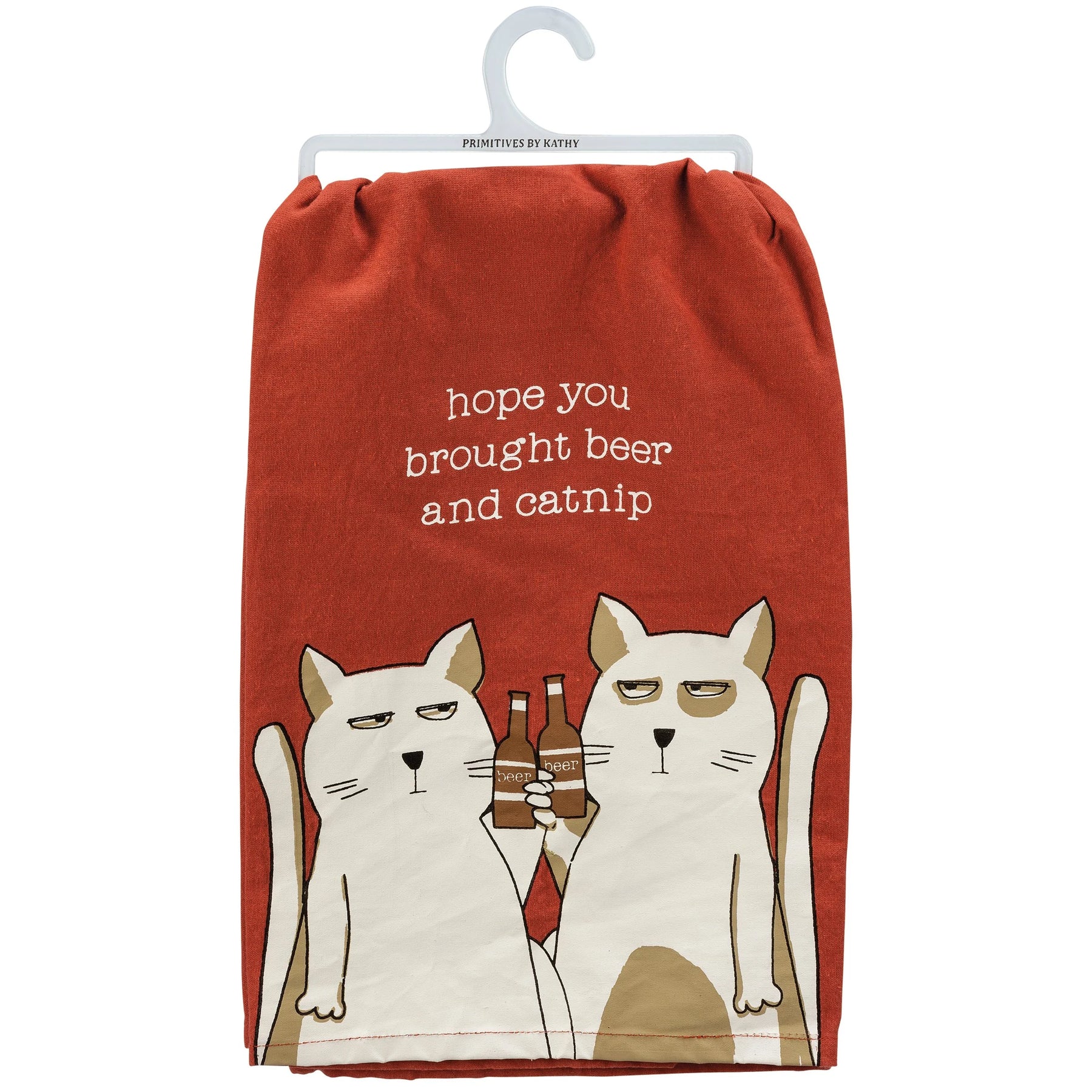 A rustic-inspired cotton kitchen towel featuring a "Hope You Brought Beer And Catnip" sentiment with sassy cat and beer design. Our Hope You Brought Beer kitchen towel is machine-washable.