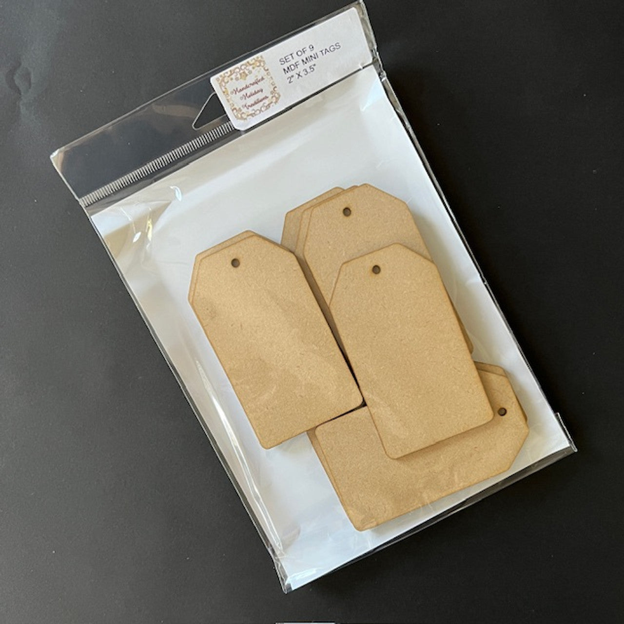 Handcrafted Holiday Traditions MDF tags measures 2" x 3.5" in a set of 9.