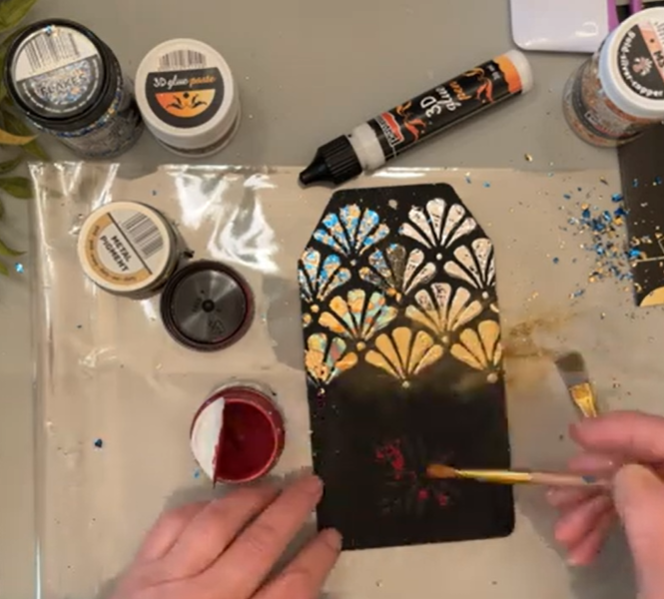 Water-based glue that dries tacky. Perfect for decorating with raised stencils using foils, flakes or velvet powders.