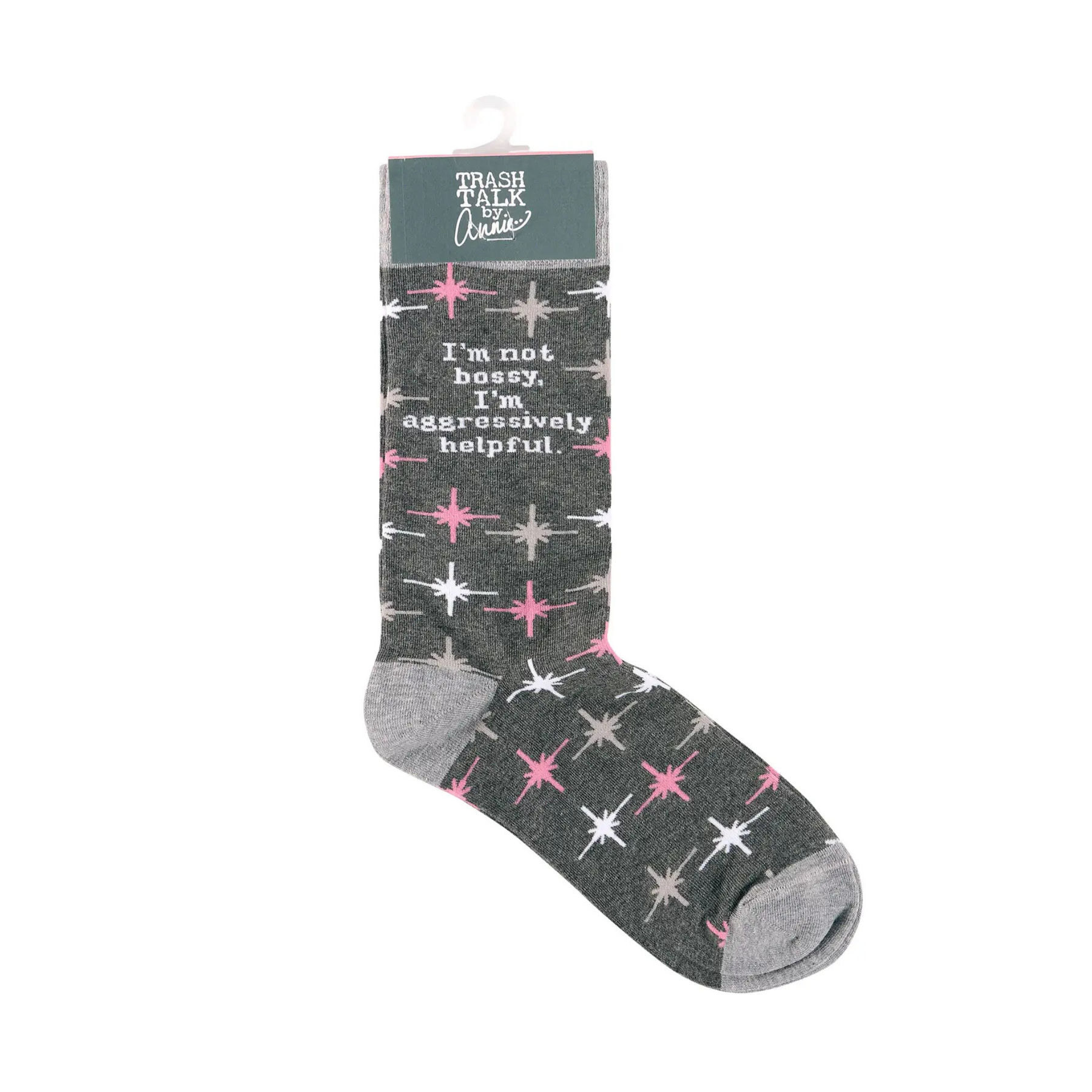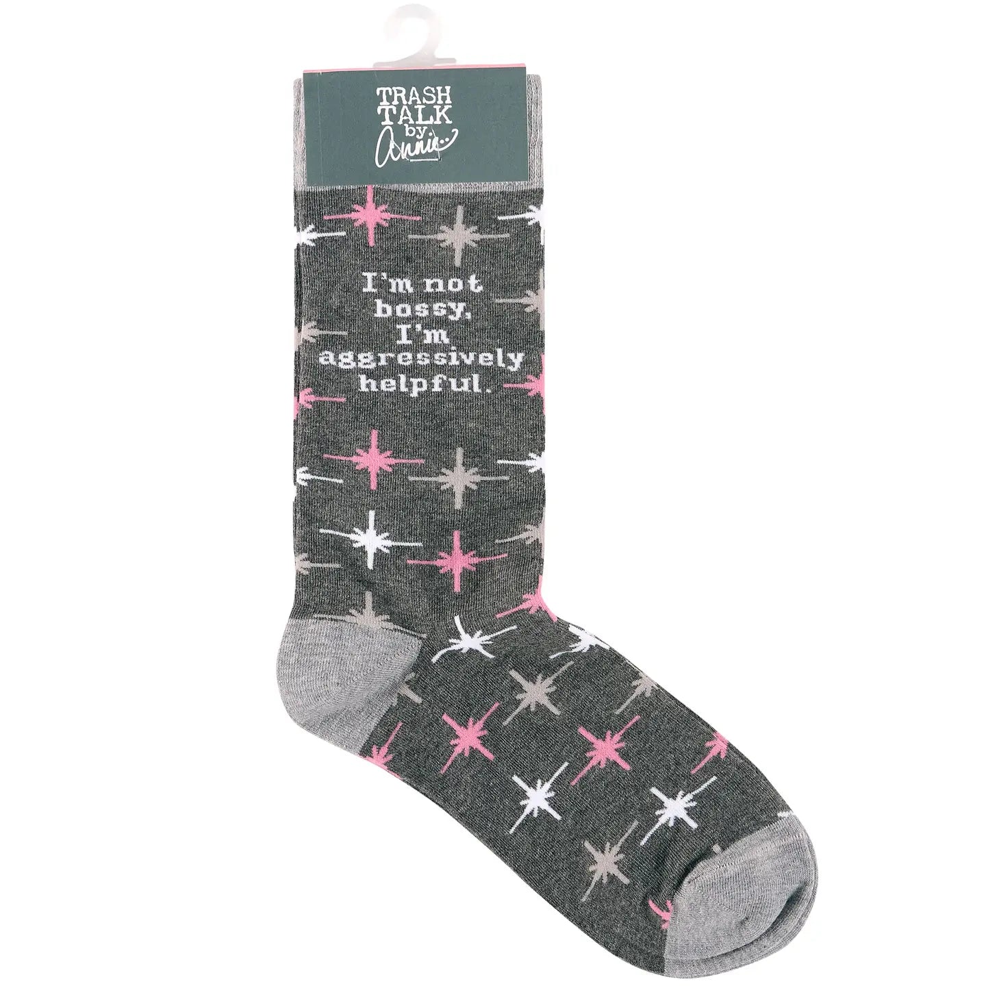 A pair of retro socks from our Trash Talk By Annie Collection flaunting a classy pink and gray pattern with a humorous sentiment that reads "I'm Not Bossy, I'm Aggressively Helpful." These cozy socks are made with cotton, nylon, and spandex to create a one-size-fits-most design.